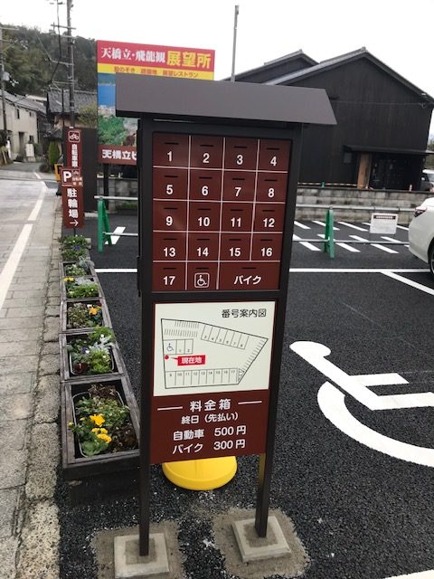 天橋立ビューランド駐車場ご利用について 投稿日:2019年12月15日 アスファルト舗装工事が完了いたしましたので本日よりご利用いただけます。 駐車スペースは以下の通りとなります。 自家用車 17台 ¥500 バイク 12台 ¥300 自転車 24台 無料 料金は駐車場入口にある料金箱にお願いいたします。 台数に限りがございますので満車の場合近隣の有料駐車場をご利用下さい。