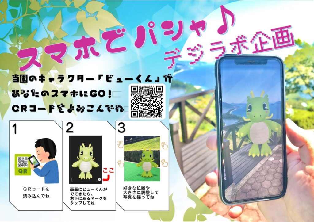 夏イベント 「大自然×AR」スマホでパシャ!夏を感じよう 投稿日:2021年08月03日 この夏、「AR」を用いた企画を開始します! 当園のキャラクター「ビューくん」が皆様のスマートフォンに現れます。ビューくんと一緒に写真を撮りましょう!!