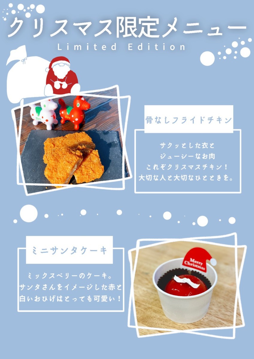 12月12日(土)本日からカフェでクリスマス限定メニュー「骨なしフライドチキン¥200」「ミニサンタケーキ¥400」限定販売しております。是非、ご賞味ください。