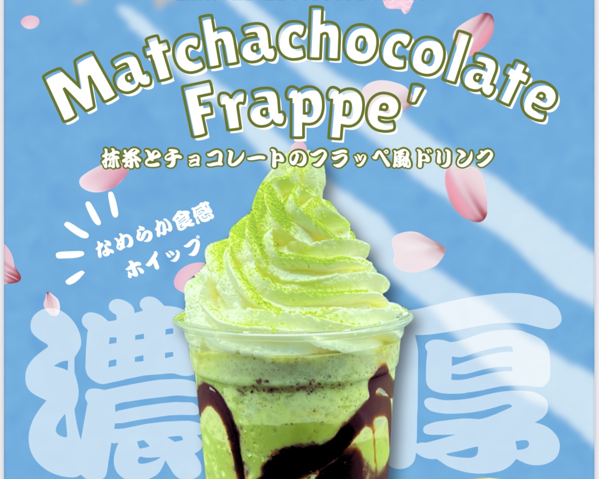 カフェ新メニュー「抹茶チョコレート」4月1日より期間限定販売 投稿日:2025年03月31日 カフェで4月1日(火)より「抹茶チョコレートフラッペ」桜の開花時期で限定販売いたします。地元のお茶屋さんの香り高い濃厚な抹茶とヒラヤミルク、とろけるチョコレートが出会った贅沢なフラッペ。ひんやりとした口当たりとクリーミーなチョコレートのコクが楽しめる大人のスイーツドリンクです。 桜を楽しんで頂きながら、ご賞味下さい。 抹茶チョコレートフラッペ ¥750(税込)