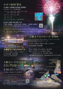 天橋立文珠側には大きな観覧エリアを設けられます(天橋立松並木内)、また、府中エリア(傘松公園側)や阿蘇シーサイドエリア、島崎エリア(宮津道の駅側に大きなメイン観覧エリア)を設けられます。